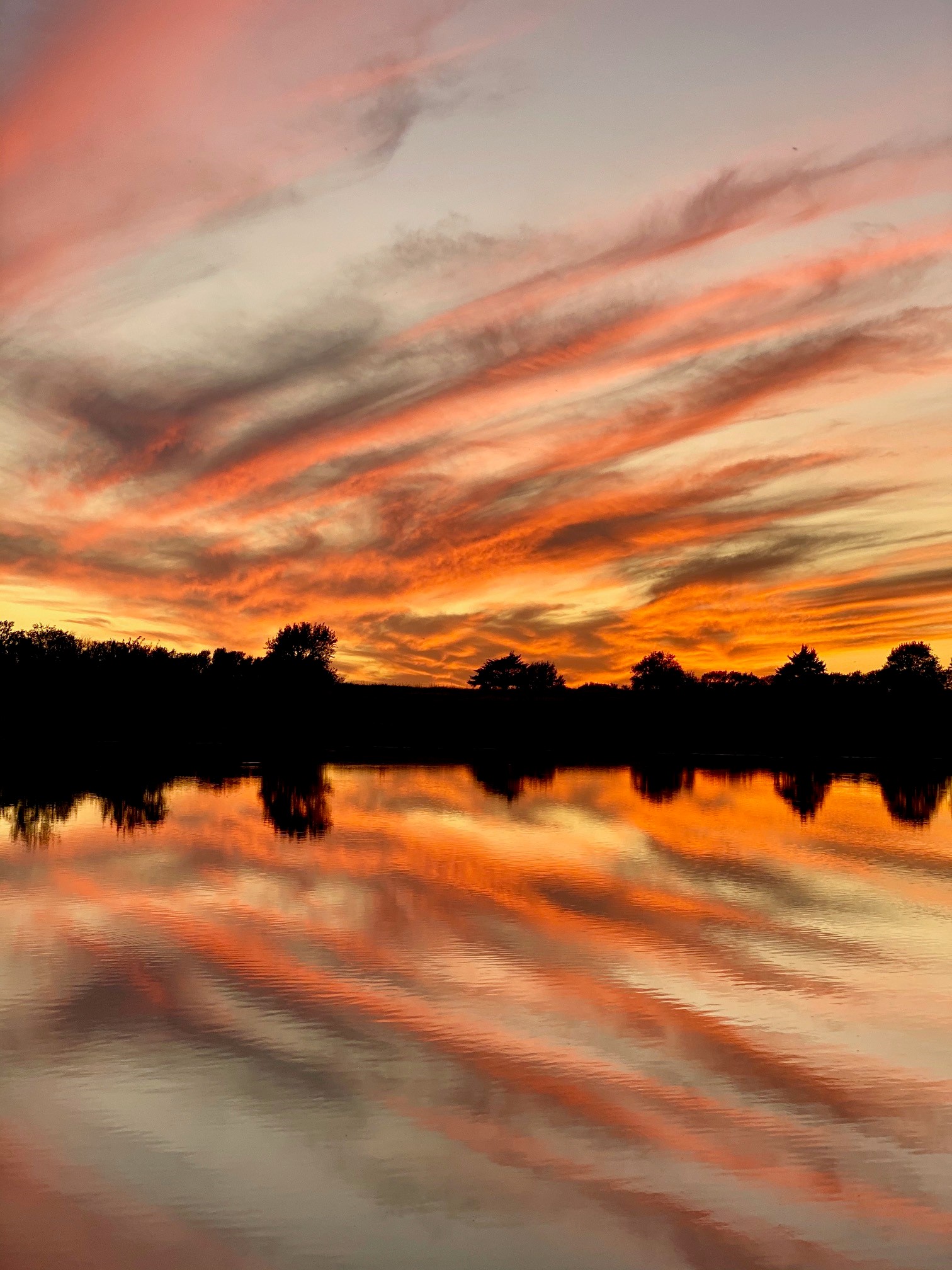 This photo was taken from my backyard that sits right by a pond. Our kitchen door sits 25ft from the edge of the water! It was in October of last year. I was doing laundry and happened to look out. There was some color as the sun was going down but nothing spectacular. A short while later, I walked into the kitchen and looked out and ran to grab my camera…I mean my phone! The water was perfectly still, and the colors were mind–boggling. I stood in the yard and took photo after photo as the sun set. The brilliance of the sky touching the water made me feel fortunate to have been home that evening. I had a few pretty nice shots of the sunset but it was easy to pick the brightest that showed the most colors. Hopefully, I’ll see more beautiful Kansas sunsets like that this October!